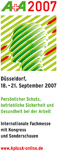 Wir stellen aus auf der A+A in Düsseldorf vom 18.9. - 21.9.2007. Internationale Fachmesse für Sicherheit + Gesundheit bei der Arbeit Persönliche Schutzausrüstung und Betriebliche Sicherheit Sie finden uns in Halle 3 Stand F90 |